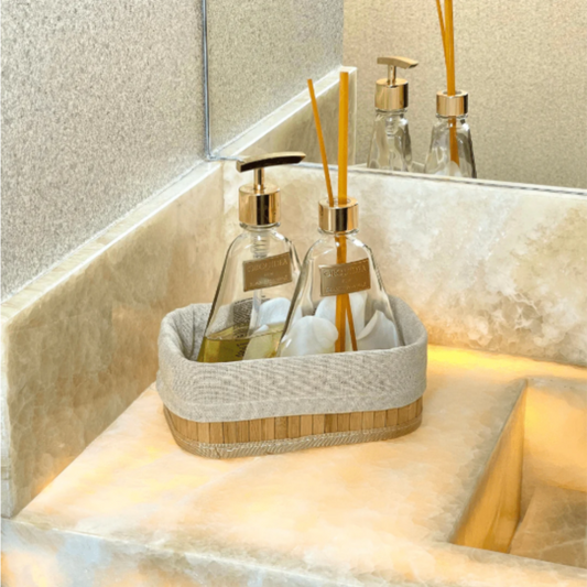 Conjunto 3 Cestos Retangulares de Bambu Com Forro em Tecido