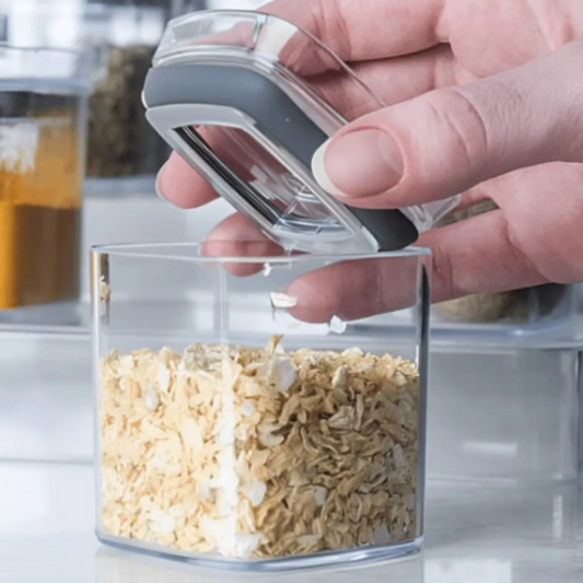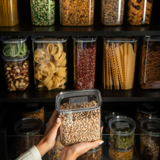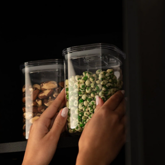Potes transparentes e resistentes, ideais para armazenar e organizar alimentos, mantendo tudo visível e acessível com praticidade.