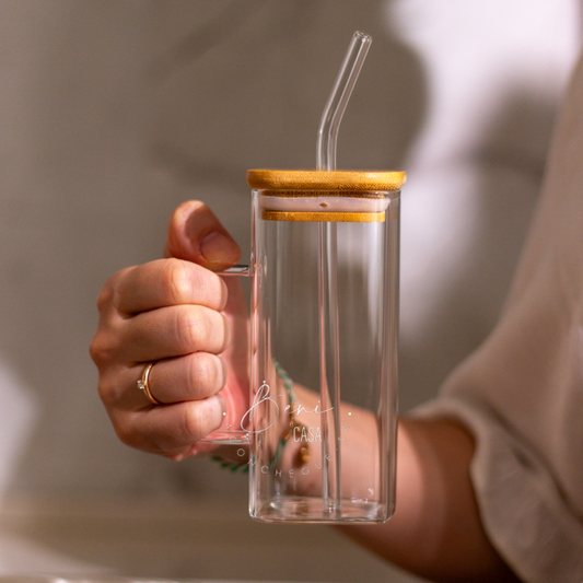 Caneca de Vidro Borossilicato com Canudo e Tampa de Bambu 400ml