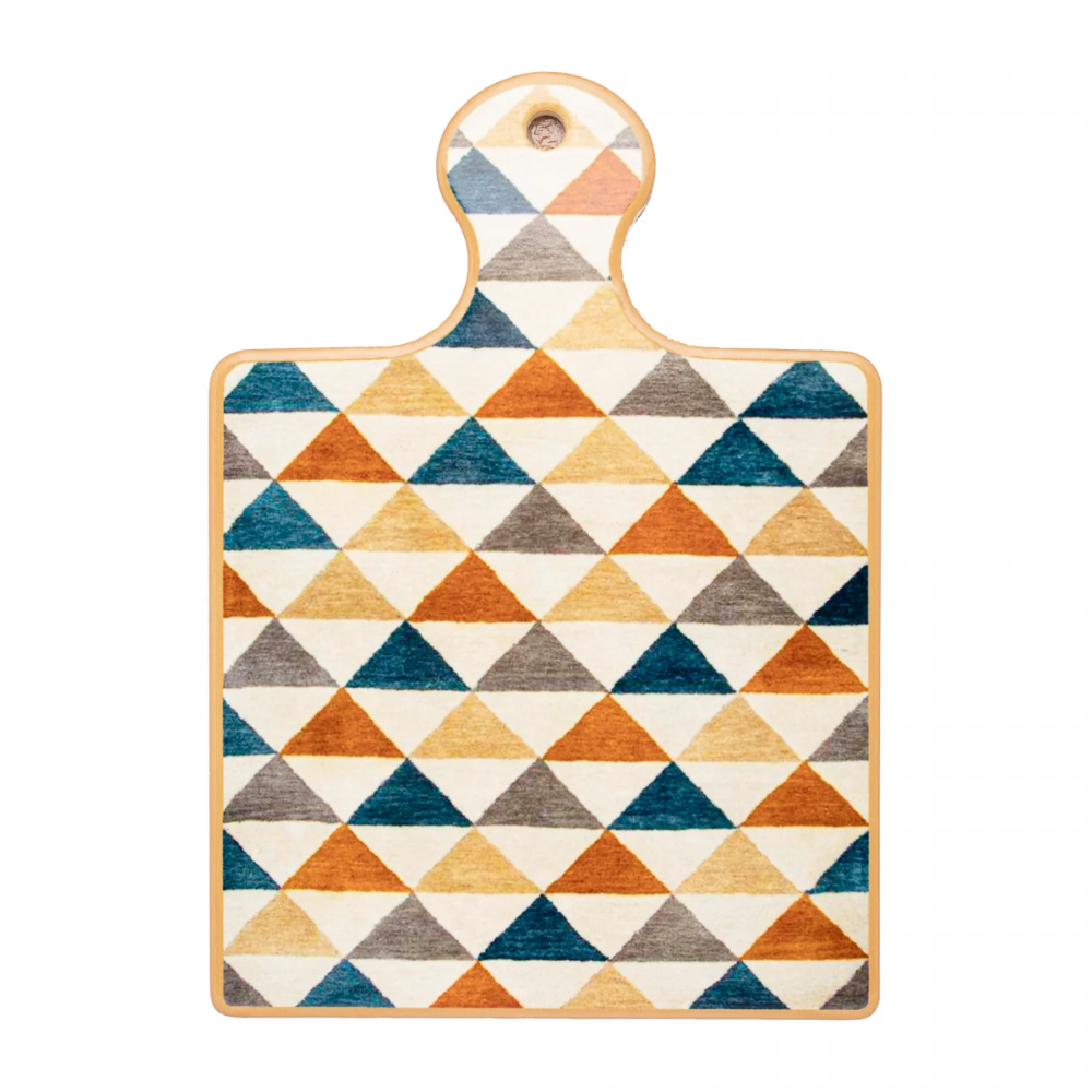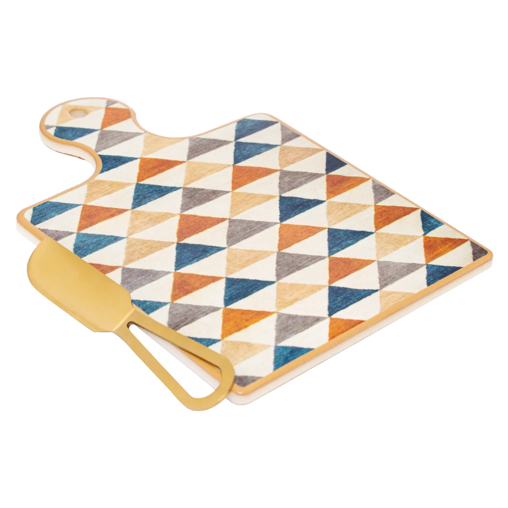 Leve mais charme e sofisticação para a sua mesa com este lindo conjunto de tábua de servir e faca para queijos. Com um design moderno e elegante, a tábua é decorada com uma estampa geométrica vibrante em tons de azul, laranja e bege, perfeita para compor uma mesa sofisticada e aconchegante.