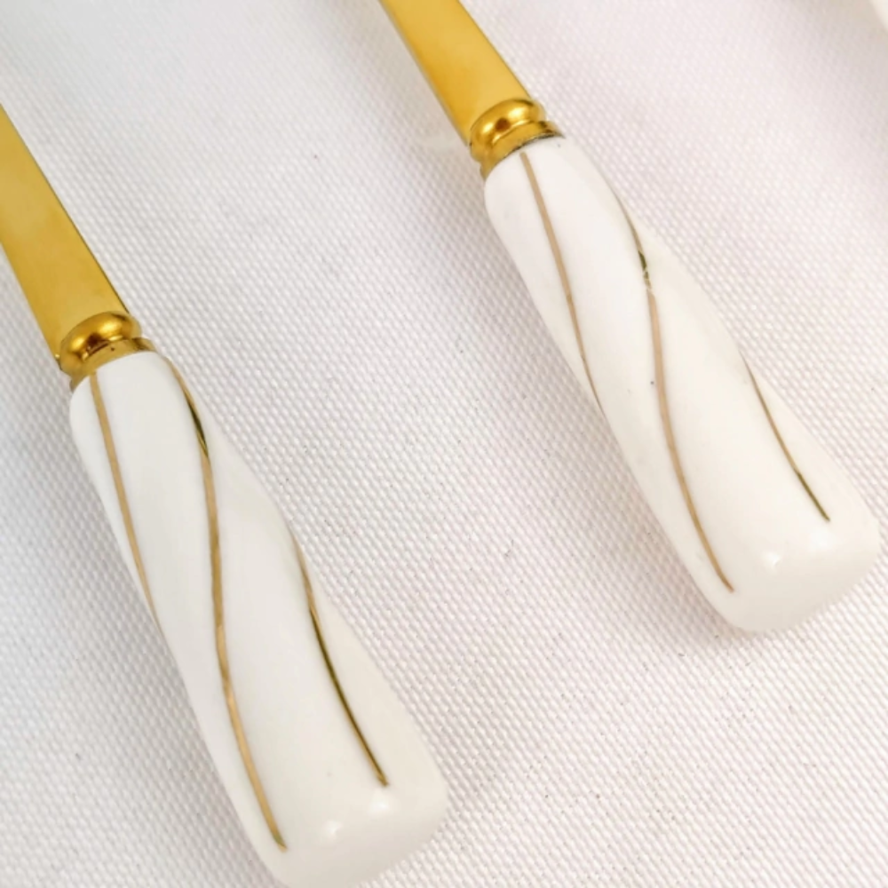 Conjunto de Colheres Douradas Florais com Cabo de Carâmica – Sofisticação e Charme à Mesa