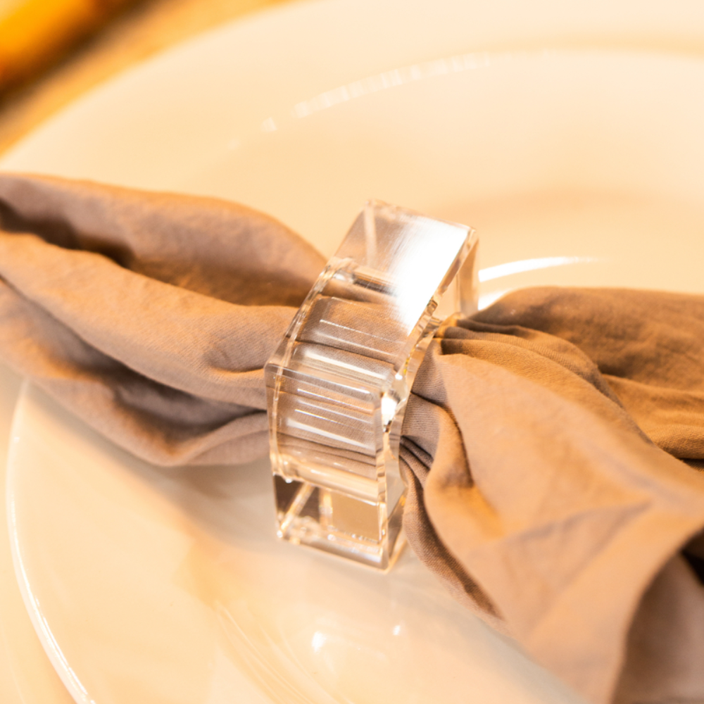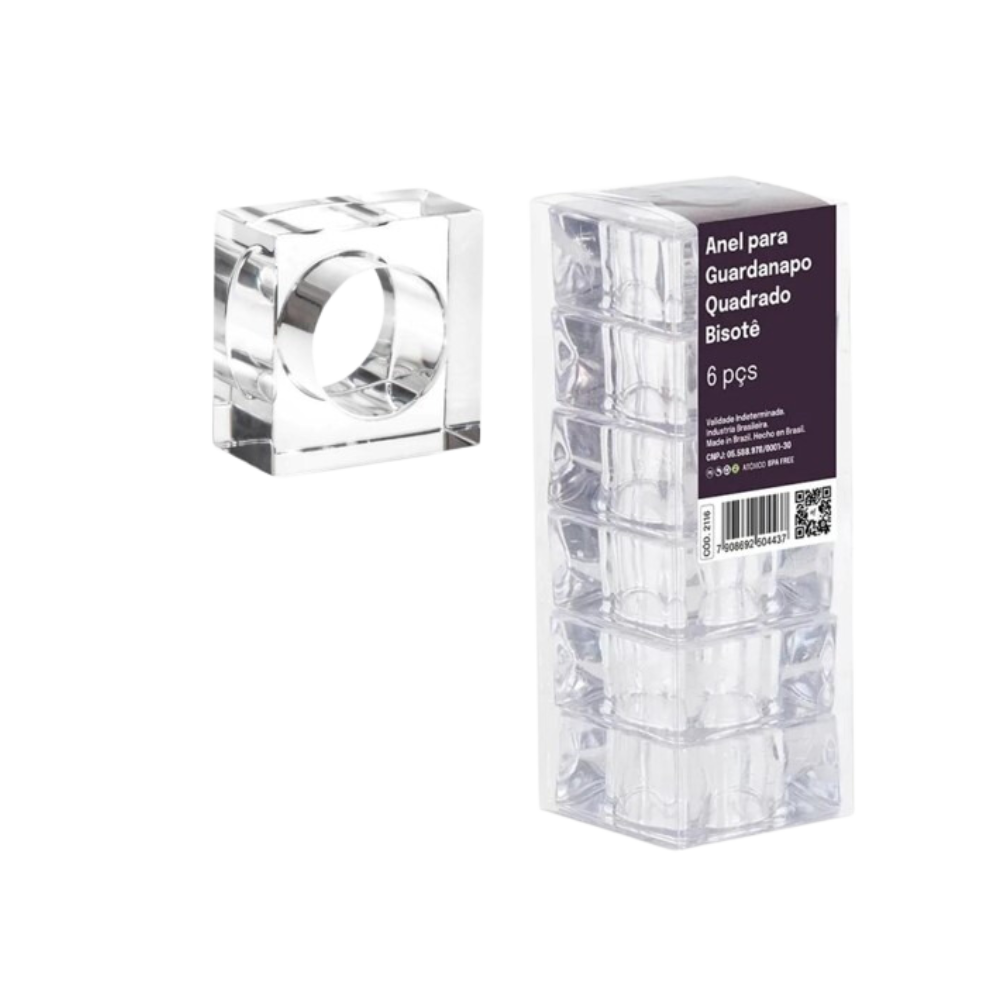 Este elegante conjunto de 6 anéis de guardanapo da linha Bisotê é a escolha perfeita para compor uma mesa sofisticada e charmosa. Com design quadrado e acabamento impecável, todo transparente, cada anel destaca-se pela sua simplicidade moderna e refinada, ideal para ocasiões especiais ou para dar um toque de elegância ao dia a dia.