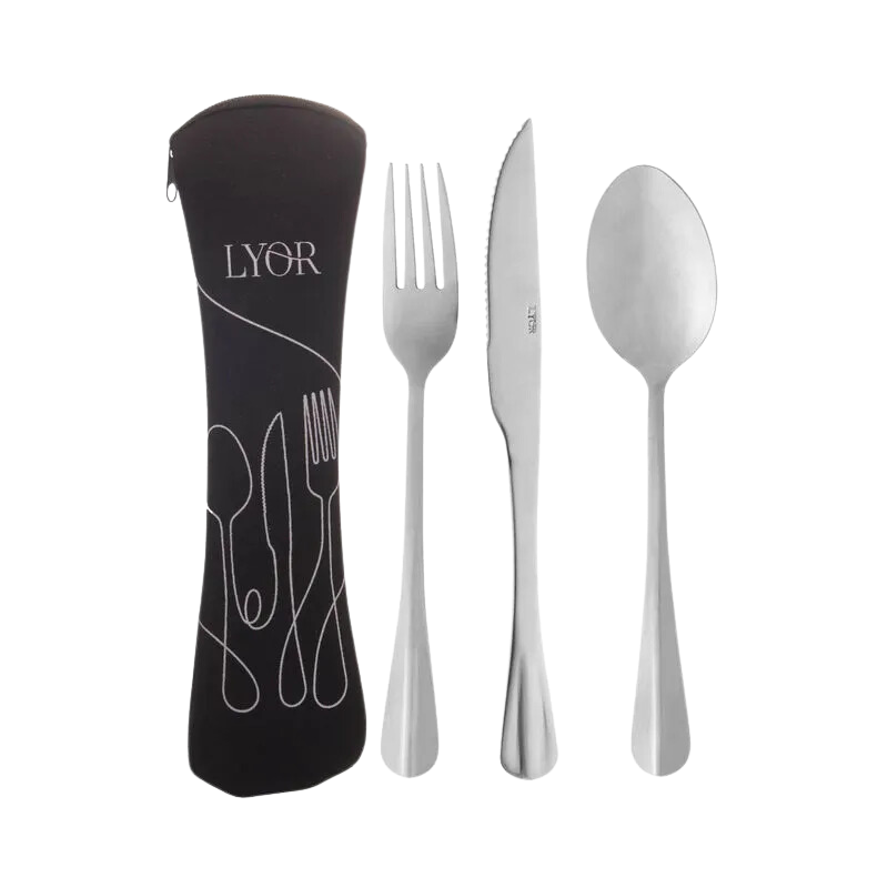 Experimente a elegância e a conveniência com nosso conjunto de talheres em aço inoxidável. Composto por garfo, faca e colher, este conjunto é perfeito para suas refeições diárias. Os talheres reutilizáveis promove a sustentabilidade, enquanto o estojo sofisticado facilita o transporte.