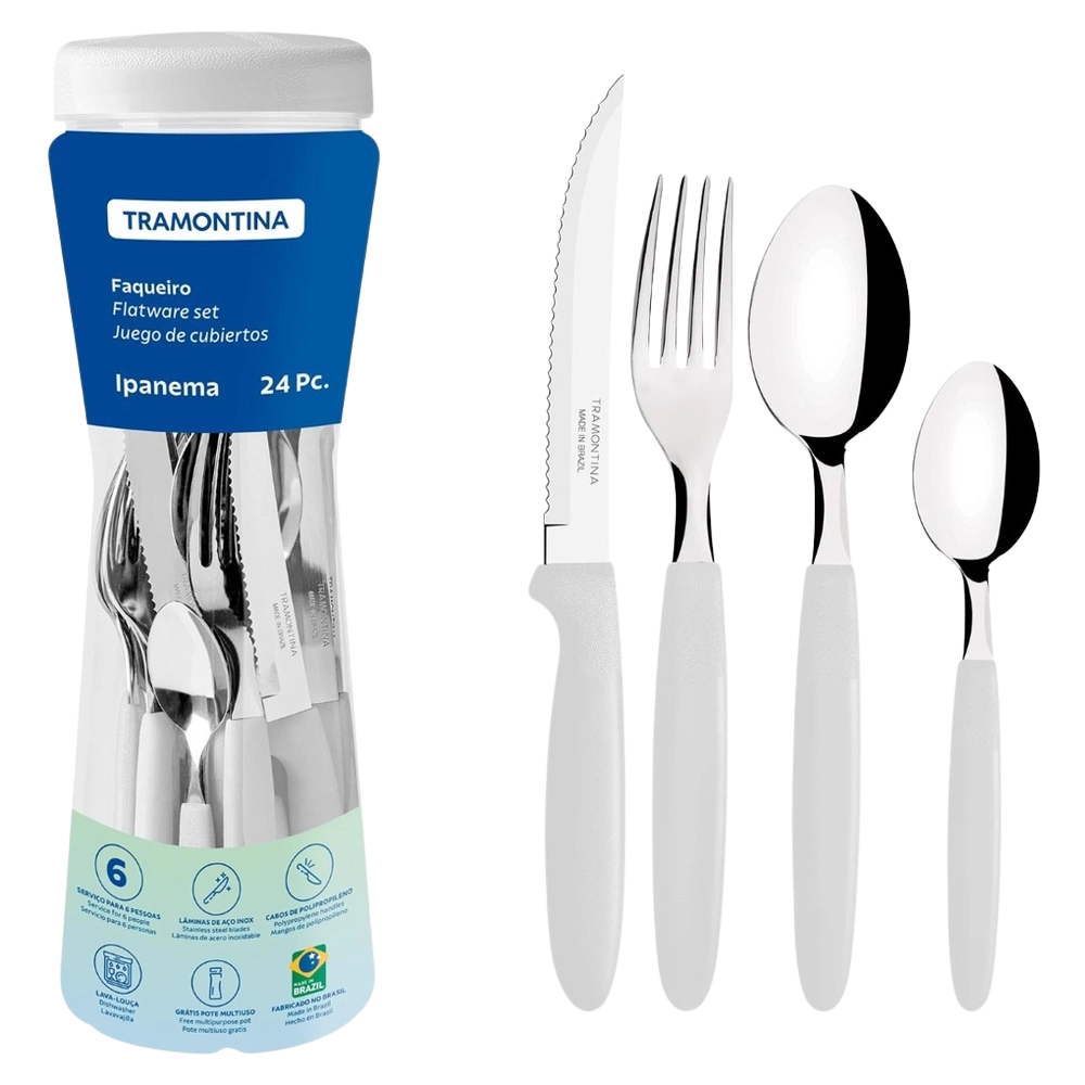 O Faqueiro 24 Peças Ipanema Branco da Tramontina é a escolha perfeita para quem busca praticidade e elegância no dia a dia. Composto por garfos, facas, colheres de mesa e colheres de chá, atende até 6 pessoas com estilo. As lâminas em aço inox garantem durabilidade e corte preciso, enquanto os cabos de polipropileno branco proporcionam leveza, conforto ao manuseio e um visual clean à mesa.